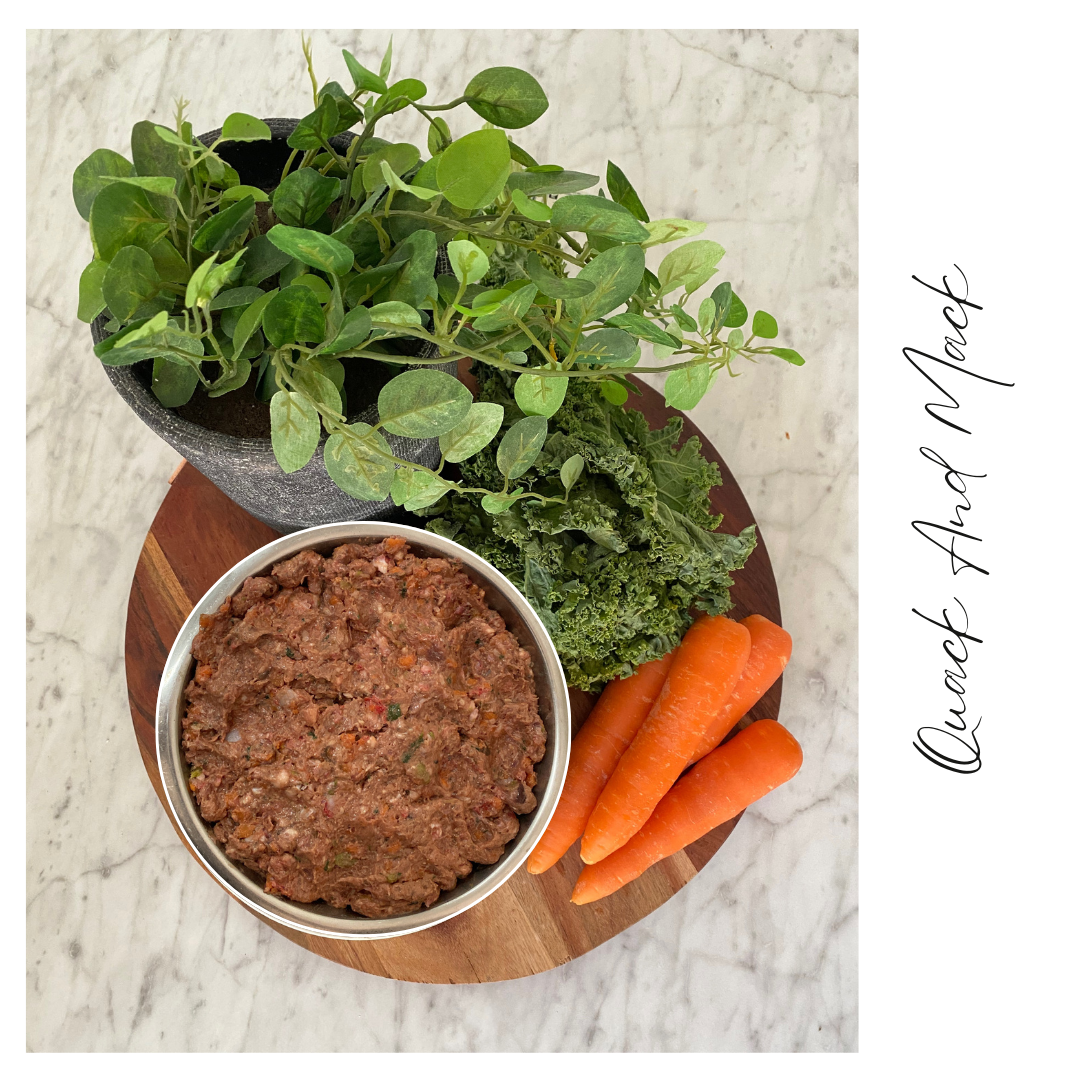 Quack & Mack – 1kg Raw Dog Food Blend Support your dog’s vitality from the inside out with Quack & Mack – a premium blend of rich duck meat, wild-caught New Zealand mackerel, and a dash of rose hip oil for joint health and mobility. This powerhouse combo delivers a punch of protein, omega fatty acids, and natural anti-inflammatories to keep your dog moving freely and feeling great. Ingredients: Why It’s a Game-Changer:
